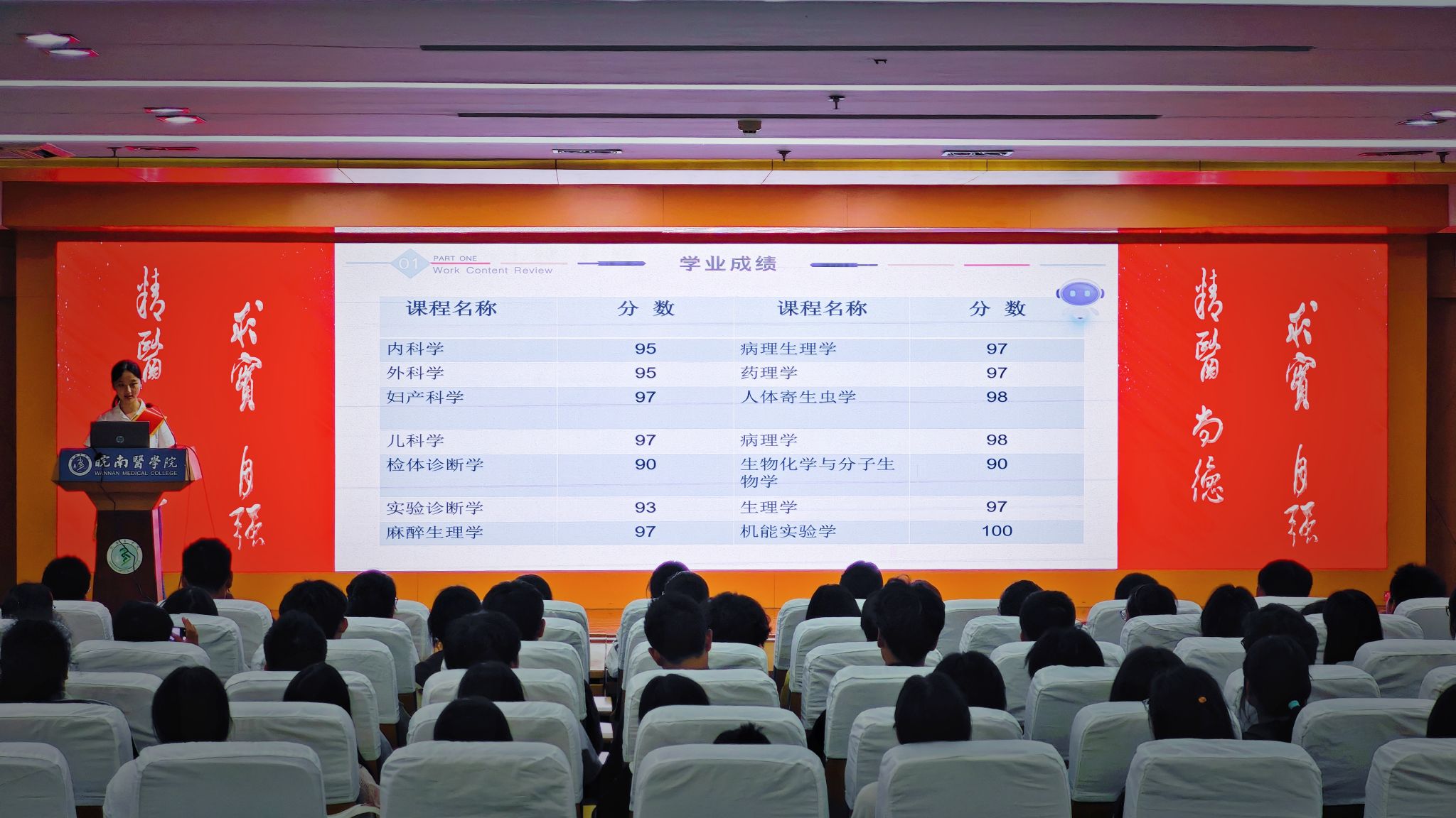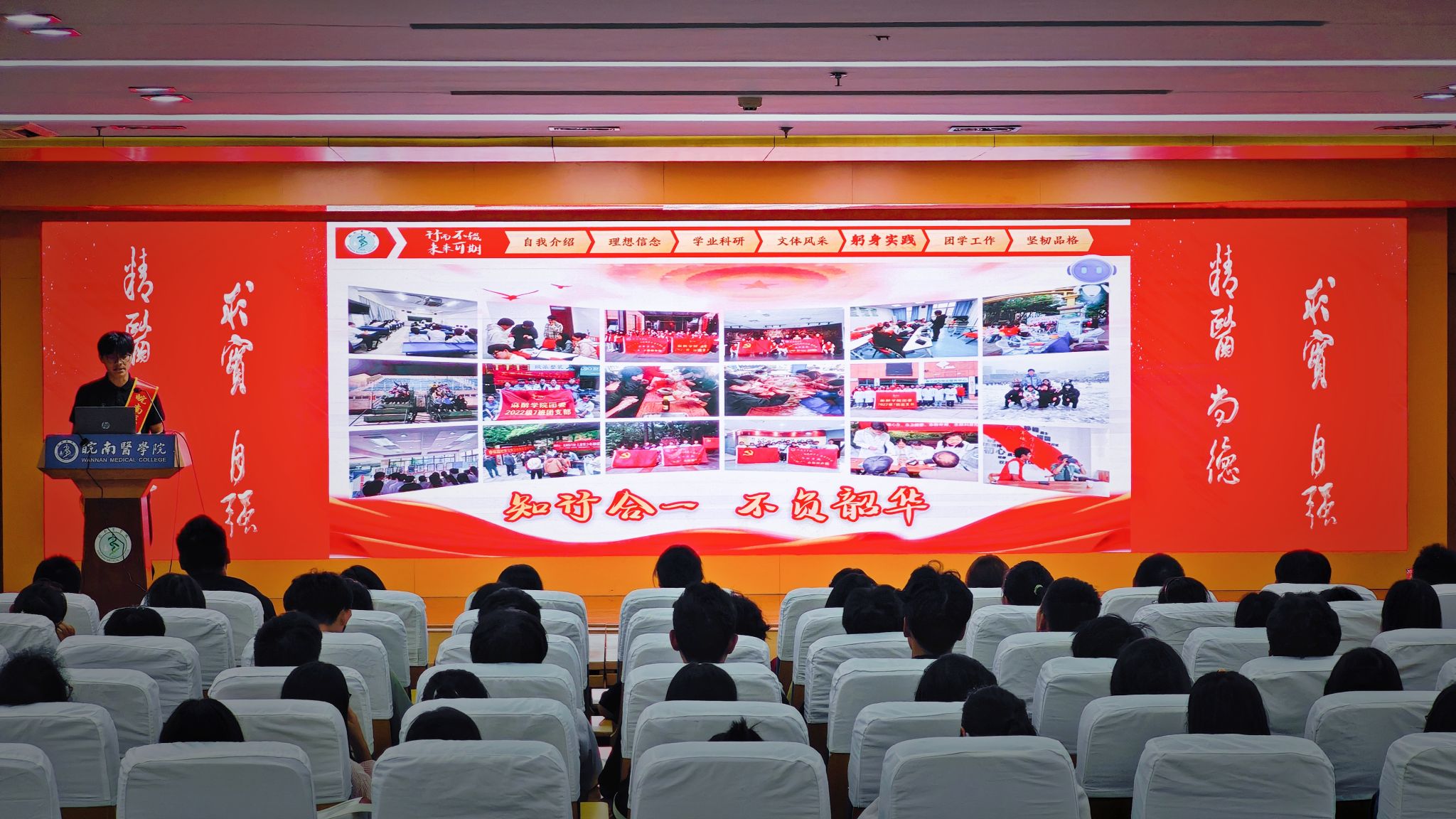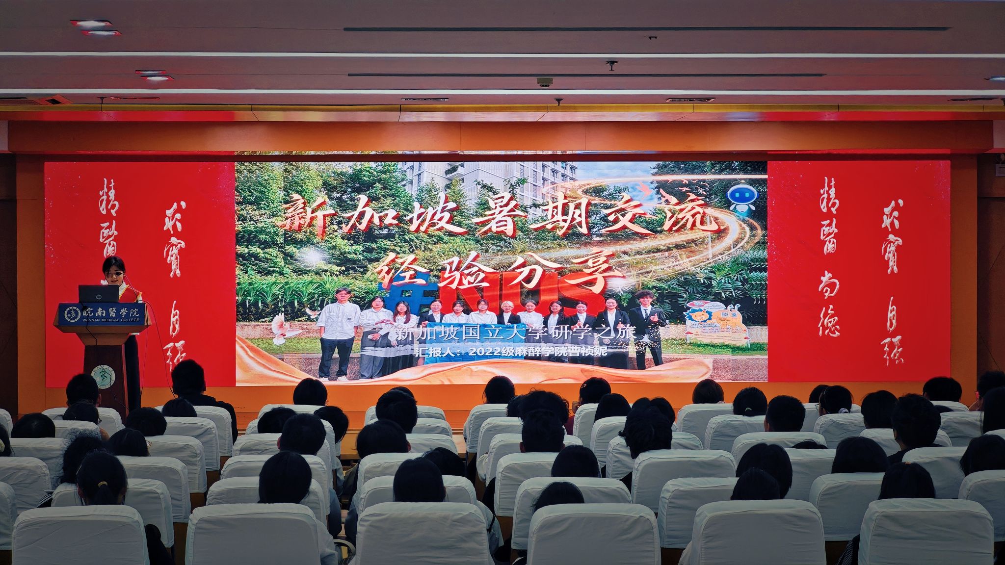 汪旭同学讲述了自己从迷彩军服到白色医袍经历,分享了自己捐献造血干细胞的心路历程,他可感可知的亲历故事和坚守“为人民服务”的初心让同学们感受到榜样的力量。纪阳斌同学用幽默的语言结合事例分享了自己在科研探索、文体活动和社会实践方面取得的成绩和感悟,他乐观向上、顽强奋斗,不向病魔妥协的事迹打动了全场观众。裴诗婉同学系统梳理了自己的学习方法和技巧,分享了保持高效率学习的秘诀,倡导将学习化为一种从容的生活习惯,她的经验为同学们如何高效学习、避免内耗提供了学习指南。曹祯妮同学分享了暑期在新加坡国立大学研学的收获,她图文并茂的介绍不仅让大家感受到与众不同的人文学术氛围,也激励更多同学善用学校提供的国际平台拓宽视野、突破自我。